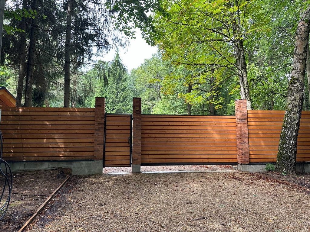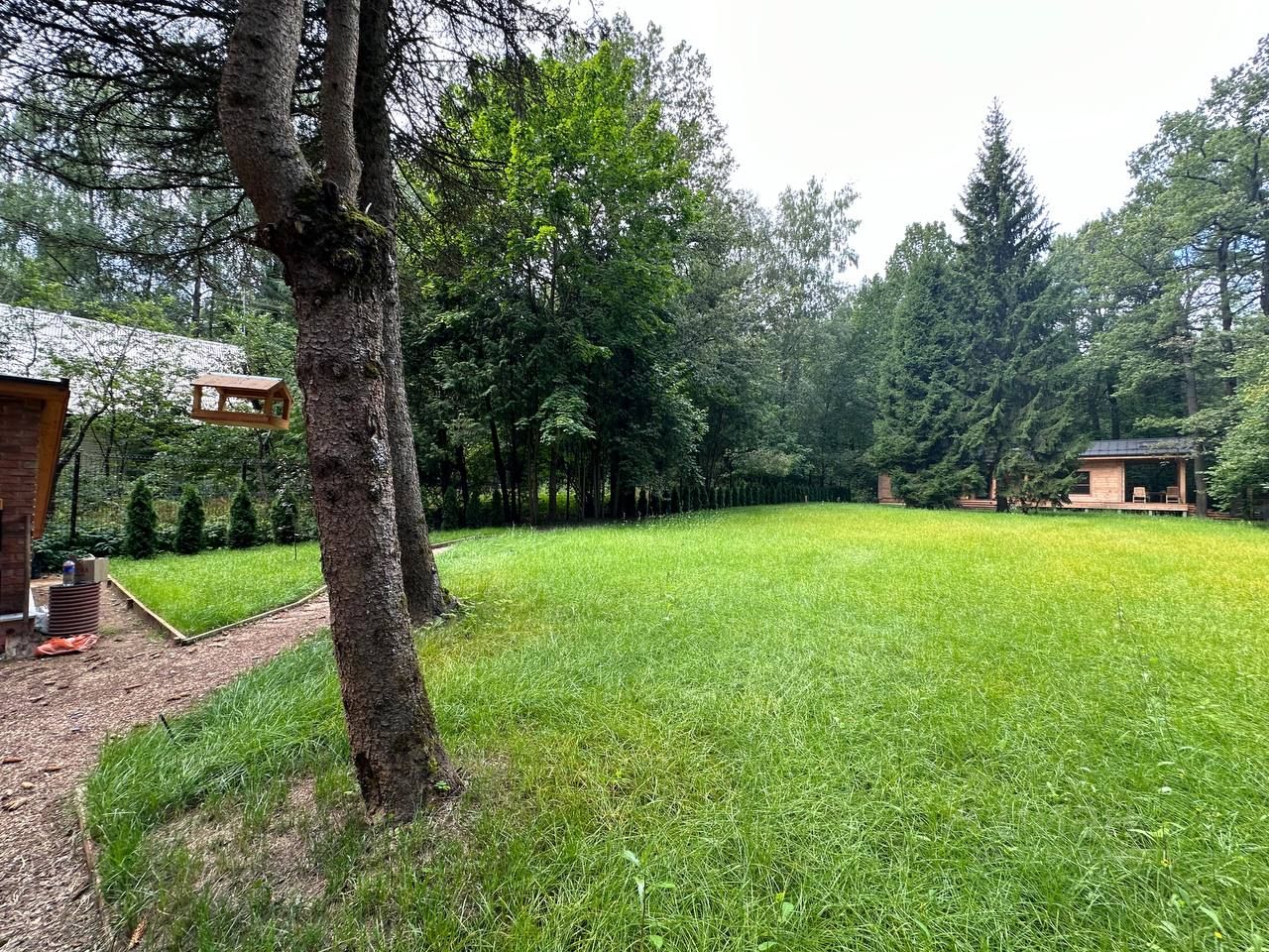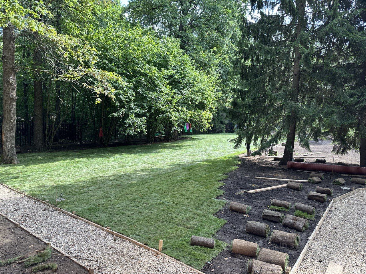 Участок уже выровнен, уложен газон, сделан полив , дренаж, разводка освещения и проведены дорожки.